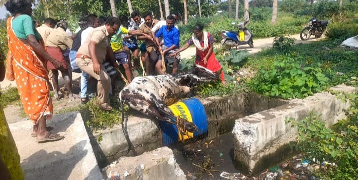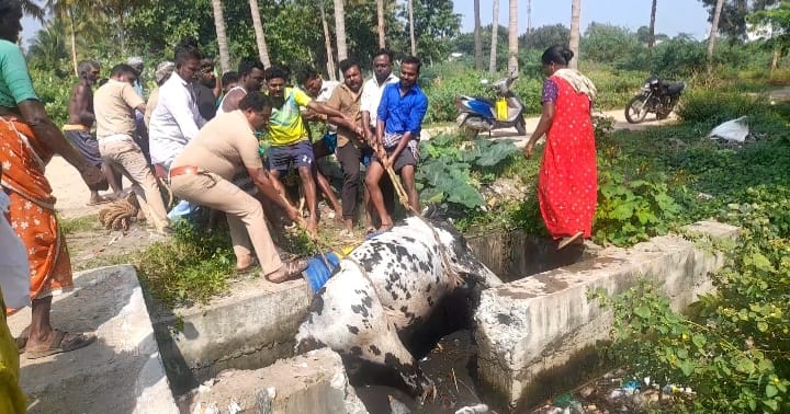 இந்த நிலையில் கால்வாயில் விழுந்த பசுமாடு உயிர் பிழைப்பதற்காக கழிவுநீரில் படுத்து போராடிக் கொண்டிருந்தது தனது வாழ்வாதாரமே பாதிக்கப்படும் நிலையில் பசு மாட்டின் உரிமையாளர் வீராயி கால்வாயில் விழுந்த பசு மாட்டினை காப்பாற்ற சொல்லி அருகில் இருந்தவர்களை அழைத்துள்ளார்.