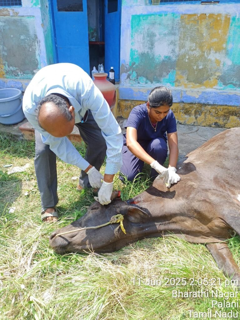 இதனை அறிந்த சமூக ஆர்வலர்கள் கால்நடைத்துறை மருத்துவர்களுக்கு தகவல் கொடுத்து மருத்துவரை வரவழைத்து மாட்டுக்கு சிகிச்சை மேற்கொள்ளப்பட்டது. பழனி கால்நடை உதவி மருத்துவர் ச.செந்தில்குமார் மற்றும் நடமாடும் கால்நடை மருத்துவ ஊர்தி 1962 கால்நடை மருத்துவர் சிவபாரதி மற்றும் மருத்துவ குழுவினர் சிகிச்சை அளித்தனர்.
