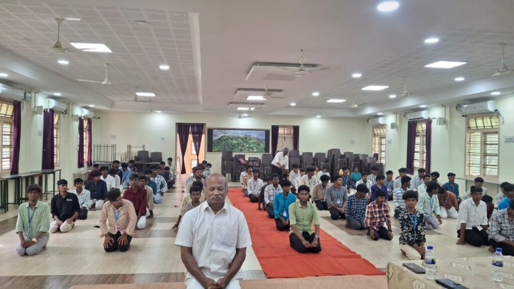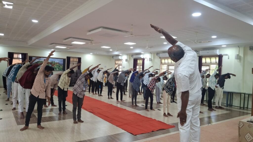 யோகா பயிற்சியினை வழங்க வாழ்க வளமுடன் பேராசிரியர் ரோஜா ஈஸ்வரி, மற்றும் பெருமாள் சாமி ஆகியோர் மாணவர்களுக்கு யோகா முக்கியத்துவம் மற்றும் பயிற்சியினை வழங்கினர்.