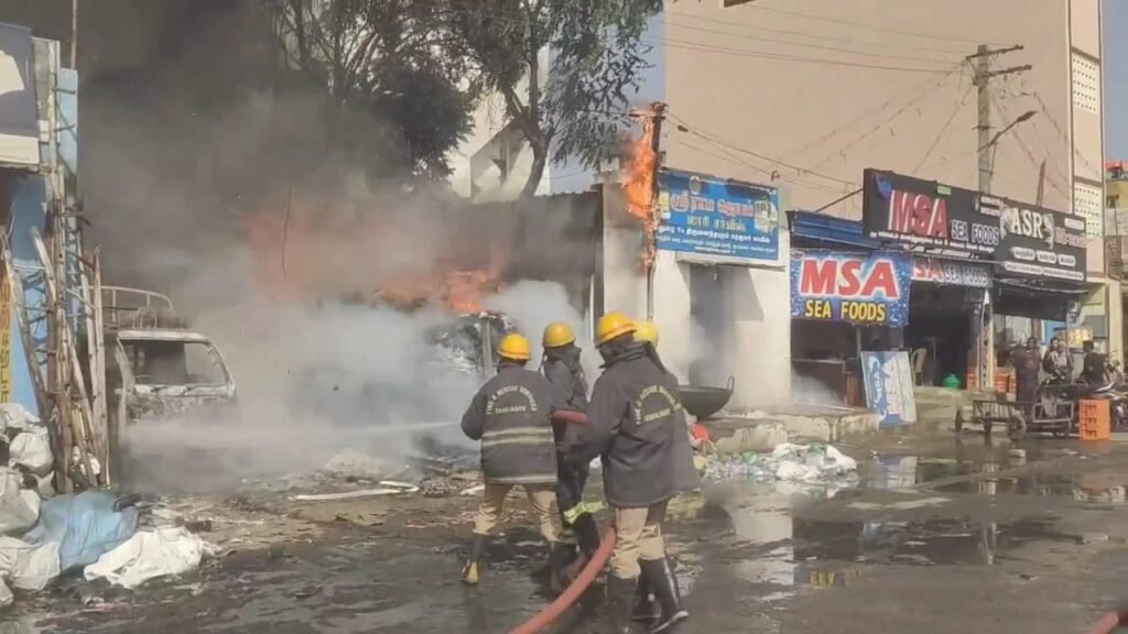 மதுரை ஓபுளாபடித்துறை பகுதியில் உள்ள பேப்பர் குடோனில் பயங்கர தீ விபத்து தீயை கட்டுக்குள் கொண்டுவரும் பணியில் தீயணைப்பு வீரர்கள்