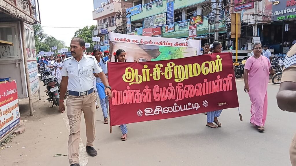 மதுரை உசிலம்பட்டி ஆர்.சி. பெண்கள் மேல்நிலைப் பள்ளி சார்பில் , மனித கடத்தல்கள், சமூக பாதுகாப்பு ,சிசு கொலைகள் மற்றும் போதை பொருள் ஒழிப்பு குறித்து பொதுமக்களுக்கு விழிப்புணர்வு பேரணி நடைபெற்றது.